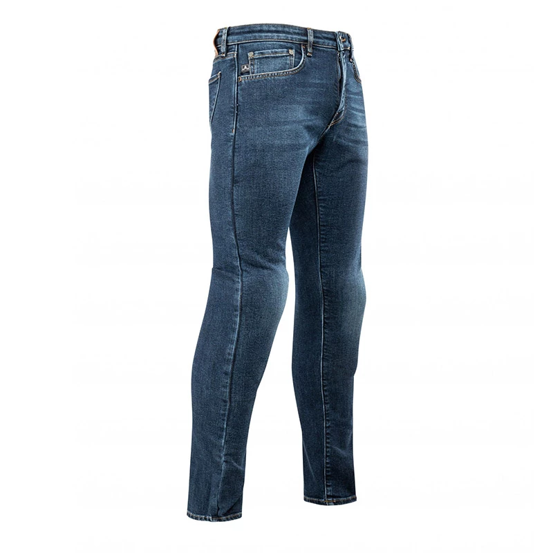 Jeans 4 seasons. CERTIFIED PANTS FprEN 17092-4:2018 class A. CERTIFIED KNEE PROTECTORS EN 1621-1: 2012 Type A Level 1. 3 front pockets and 2 back pockets. Materials. COMPONENTS: Shell: 98% Cotton 2% Elastane. Lining: 80% Polyester 20% Cotton. Insert: 72% Polyester 28% Aramid. MATERIALS: Outer: Fabric for pants in denim 11.05 oz stretch made uo to recycled materials. Inner: Reinforcement in aramid fiber on the hips and back.