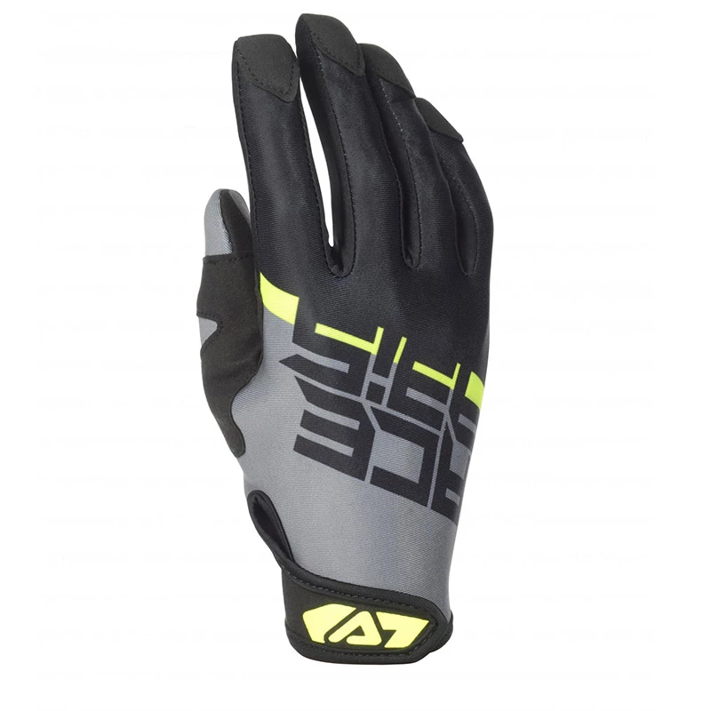 Enduro fit. CERTIFIED GLOVES CE EN 13594:2015 Lev 1. Glove fit extremely precurved and comfortable without stitching on the fingertips. Cuff regulation. Touch Screen Printing on index and thumb fingers. Refractive Insert on outer side of little finger. Double reinforcement on bottom palm. Materials. COMPONENTS: 65% POLYESTER. 32% NYLON. 3% POLYURETHANE. MATERIALS: Back hand: No-wind fabric with digital printing features. Palm: Single panel in Synthetic Leather, double reinforcement on bottom. Outer reinforcement in sinthetic leather, padding 3MM and inner reinforcement resistant to tearing and abrasion.