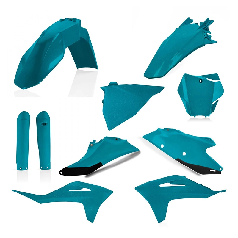 Kit complete with plastics, which includes front fender, radiator spoiler, side number plate, rear fender, filter case cover, pilasters, front number plate.