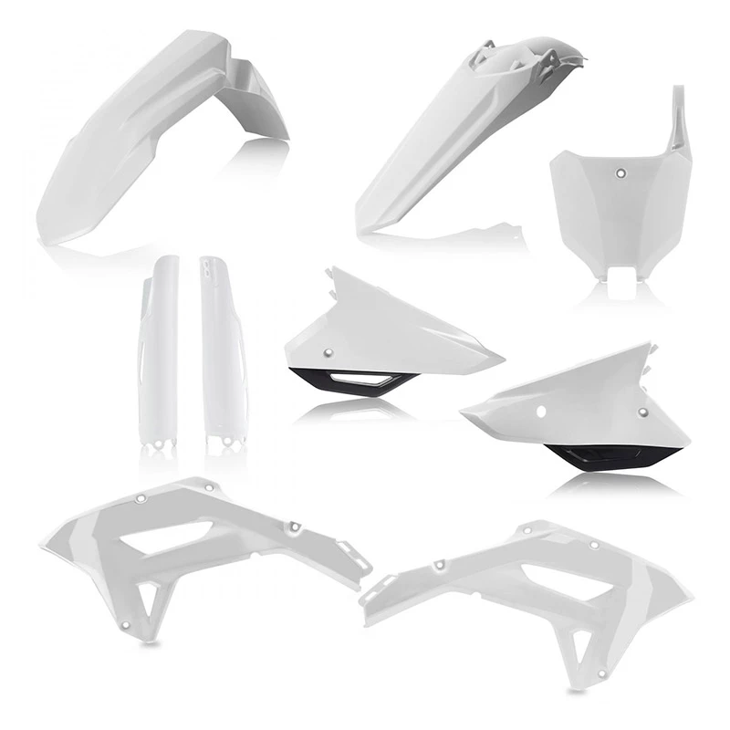 Kit complete with plastics, which includes front fender, radiator spoiler, side number plate, rear fender, filter case cover, pilasters, front number plate.