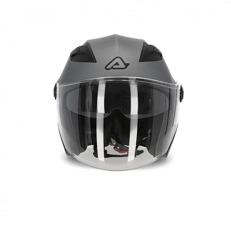 Adjustable and removable transparent visor in scratchproof material, extended to the chin area.